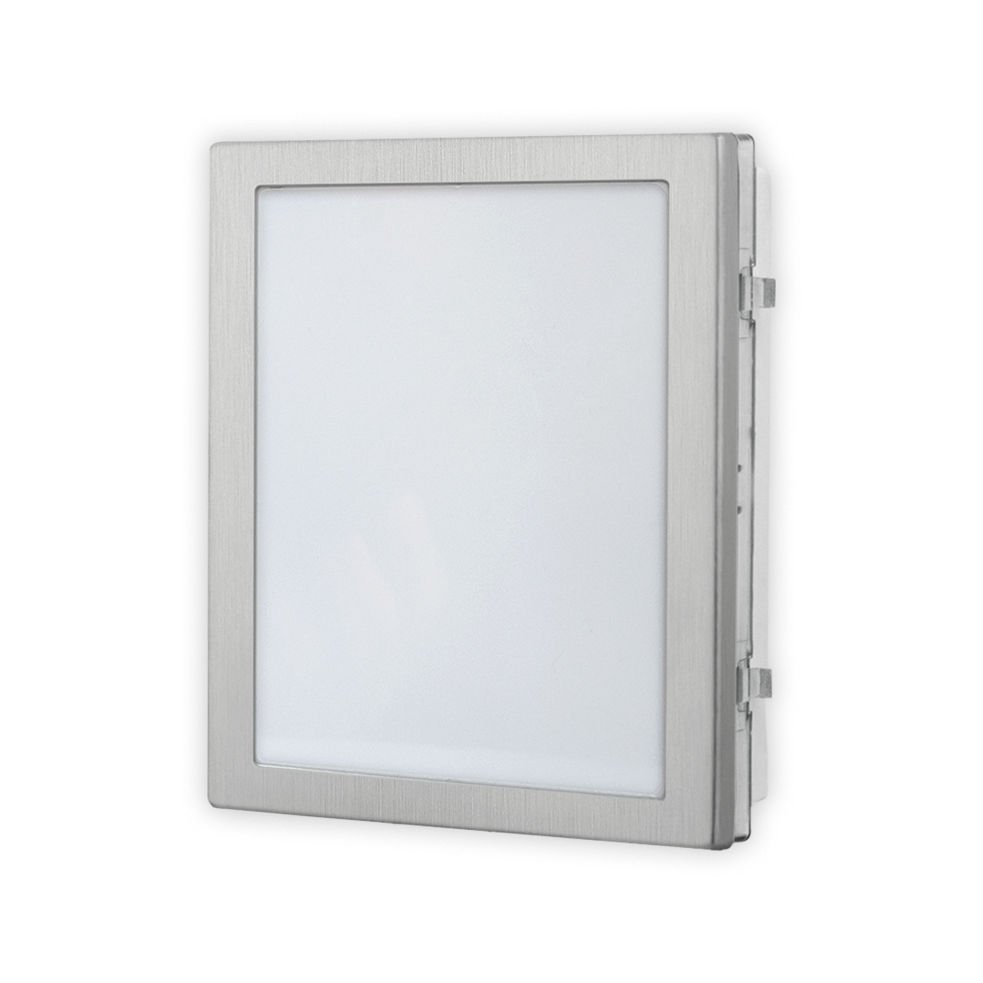 Information module 4000 Series for IPure, VX2300 and GSM systems. Blue LED backlighting Frame in AISI 316 brushed stainless steel (marine grade) that provide durability in installations subject to atmospheric agents and near marine environments, transparent polycarbonate cover (83x104mm), writeable card (96x113mm). Vandal resistant plate with IK07 and IP65 protection rating. Operating temperature -20°/+60°C. Power supply 12V DC - 30mA. Dimensions: 103x120x43mm. 1 module.