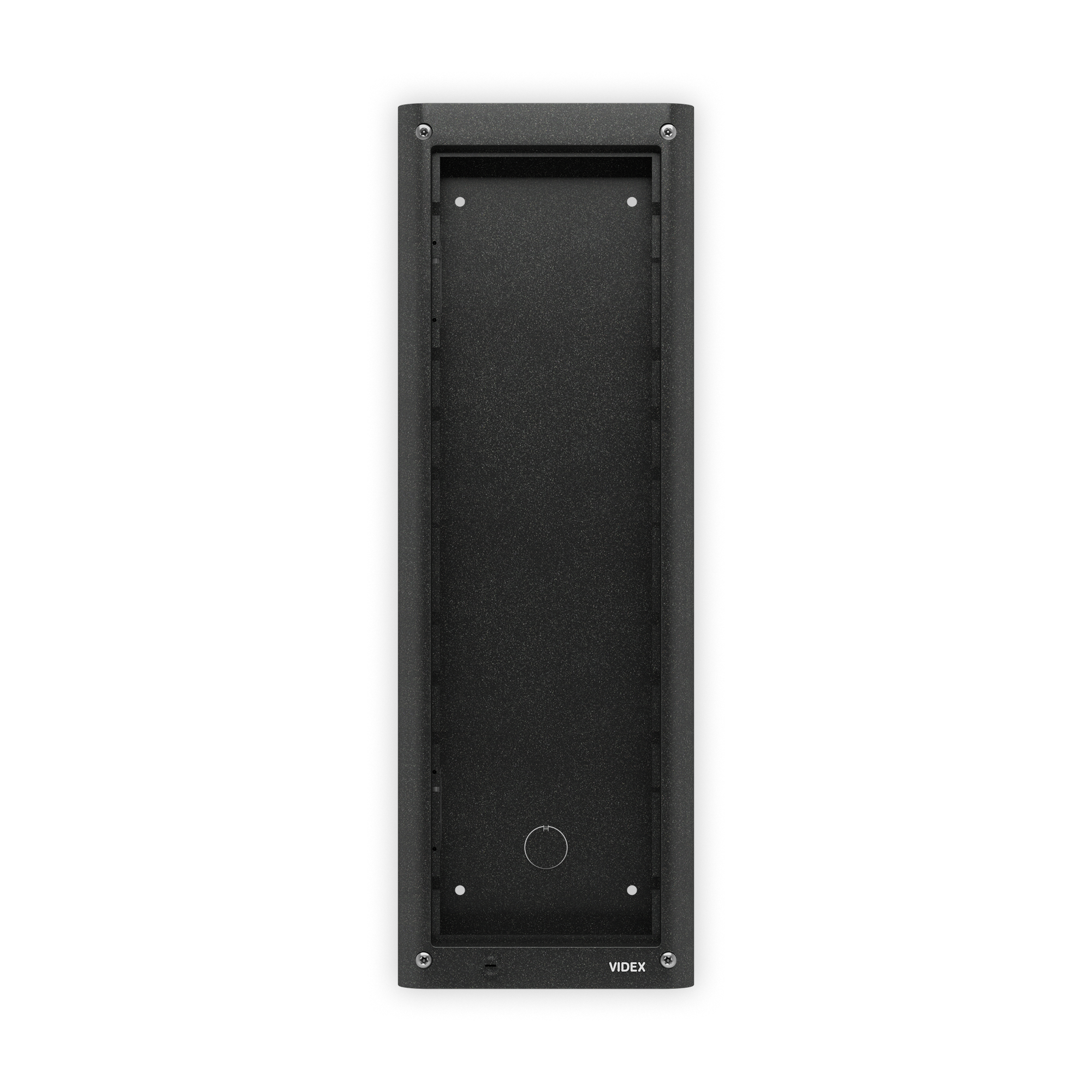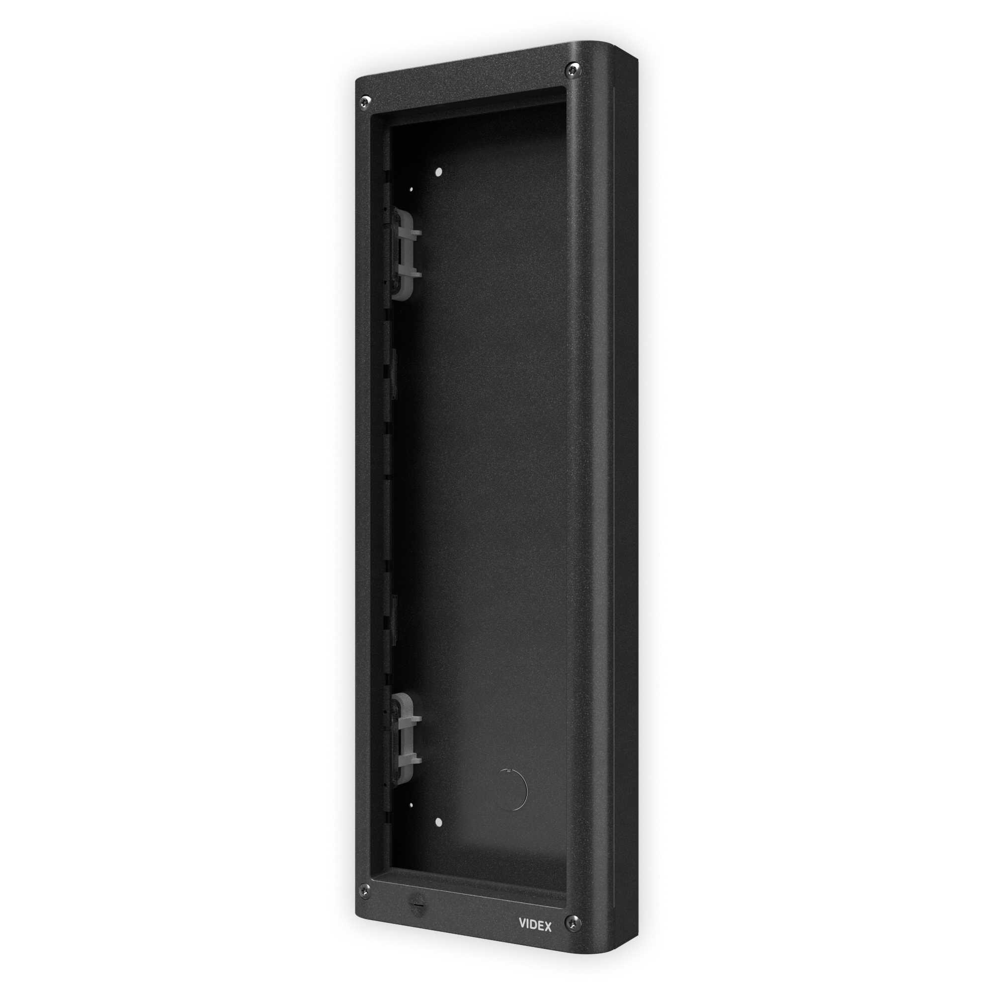 Composed of: surface box and module holder frame. The frame includes 4 Torx type security screws, a sealing gasket and side hinges to allow the frame to be opened for installation or inspection. Dimensions 135x400x44mm, gunmetal grey colour.