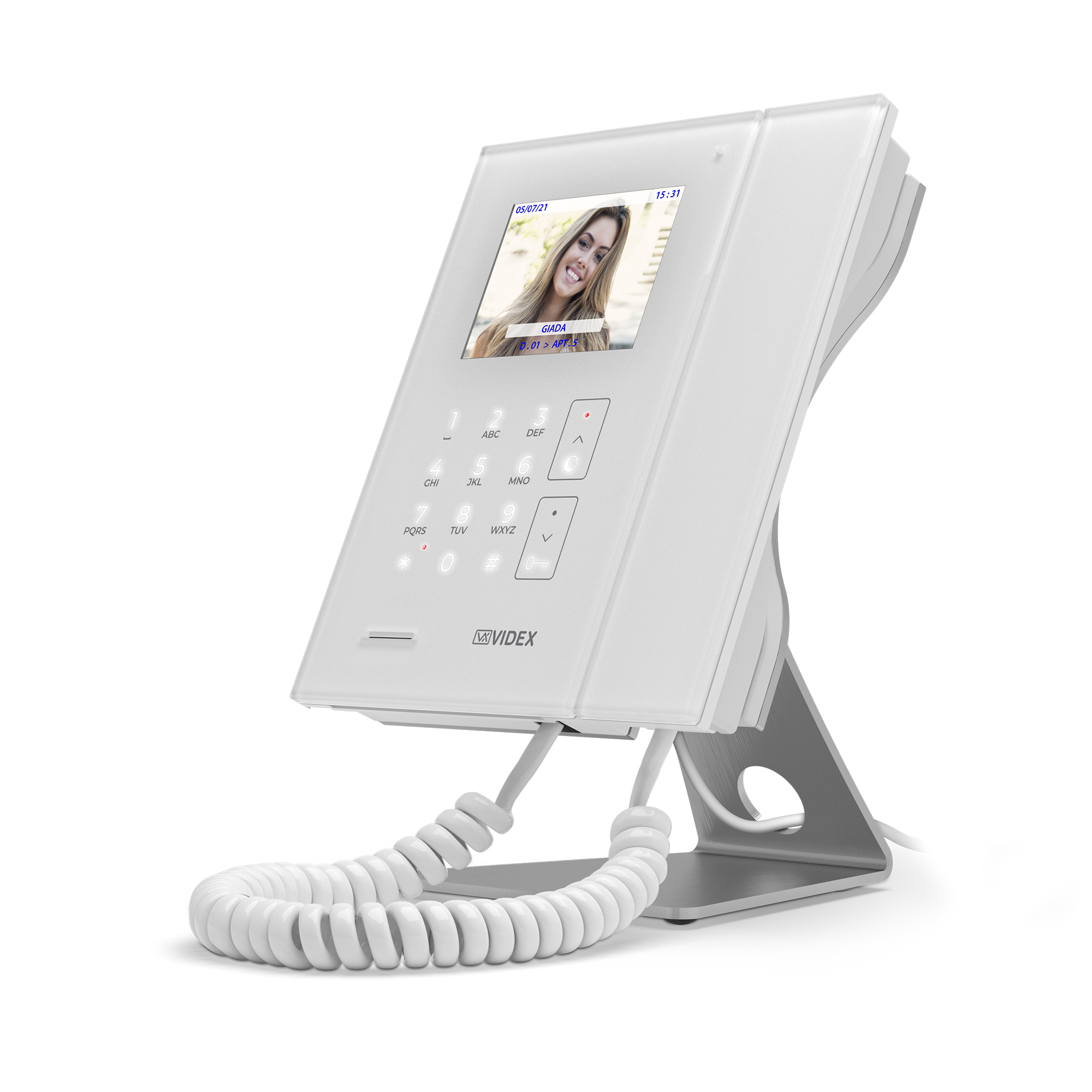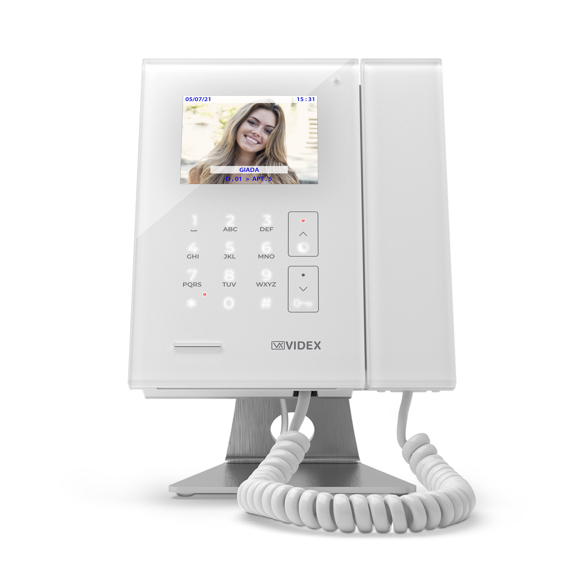 3.5" TFT OSD LCD monitor with Real Time Clock, power supply by BUS, capacitive touch backlit keyboard, 2 direct buttons for Day/Night mode and open door, 2 two-tone status LEDs. Complete with support.