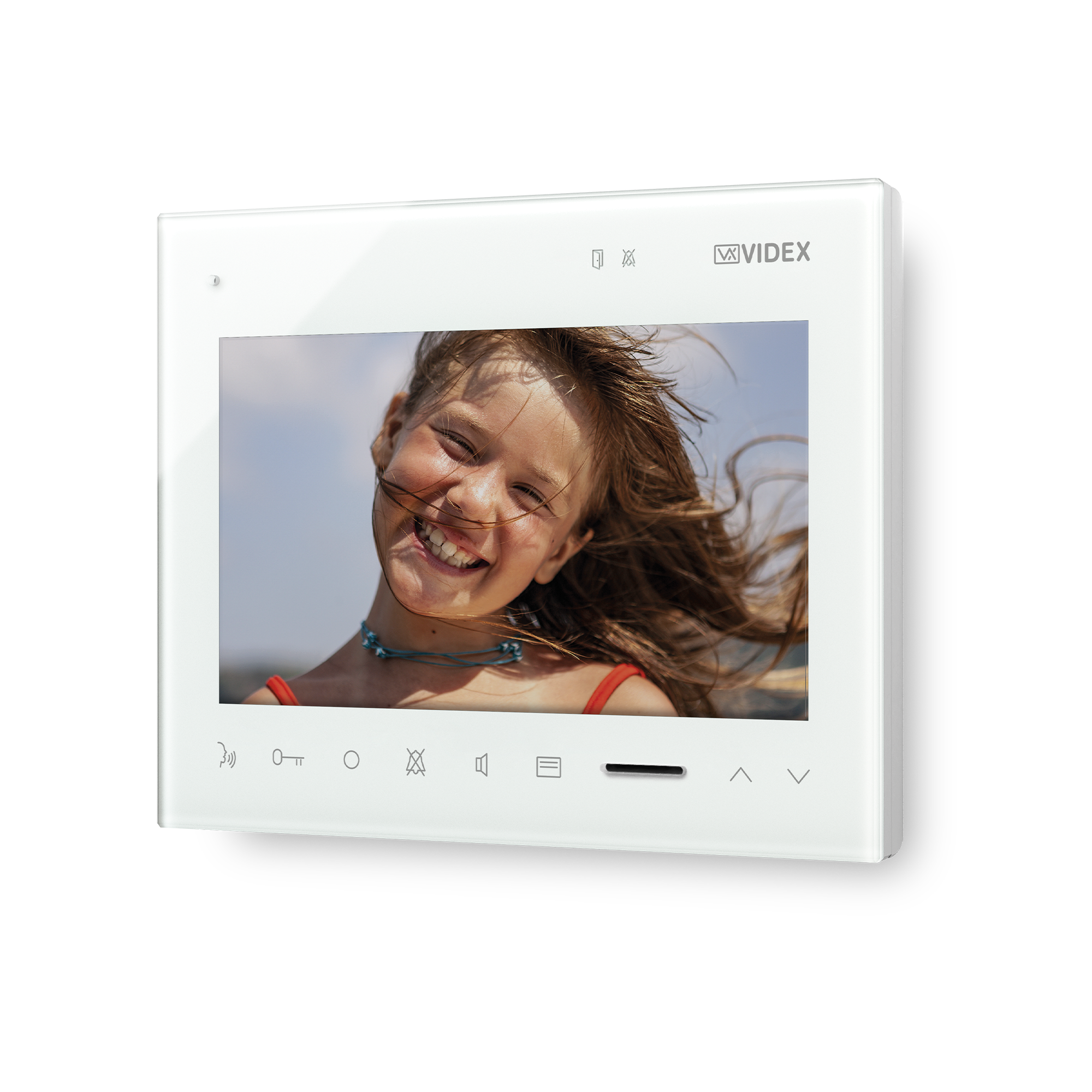 Intelligent Hands free video monitor for the VX2200 digital system using a 7” 800x480 pixel resolution full colour active matrix LCD monitor with capacitive touch sensitive buttons for “door open/concierge call” , “answer/camera recall”, “service button“, “privacy” plus 4 buttons for adjustment and programming and 2 LED’s related to the videophone operation. 2 LED’s indicating the door open/close status (requires an additional wire) and the activation/deactivation of the privacy are also inclusive. The videomonitor includes an intercommunication facility (available only between the Kristallo range of videophones and intercoms) that enables intercommunication between devices in the same apartment (same PHONE ID but different extension address) or between devices installed in different apartments (different PHONE ID). Programming and settings are available through the touch buttons. Adjustable speech and melody volume, picture brightness and hue, programmable number of rings, aux service duration, privacy service duration, melody and the extension ID for intercommunication.