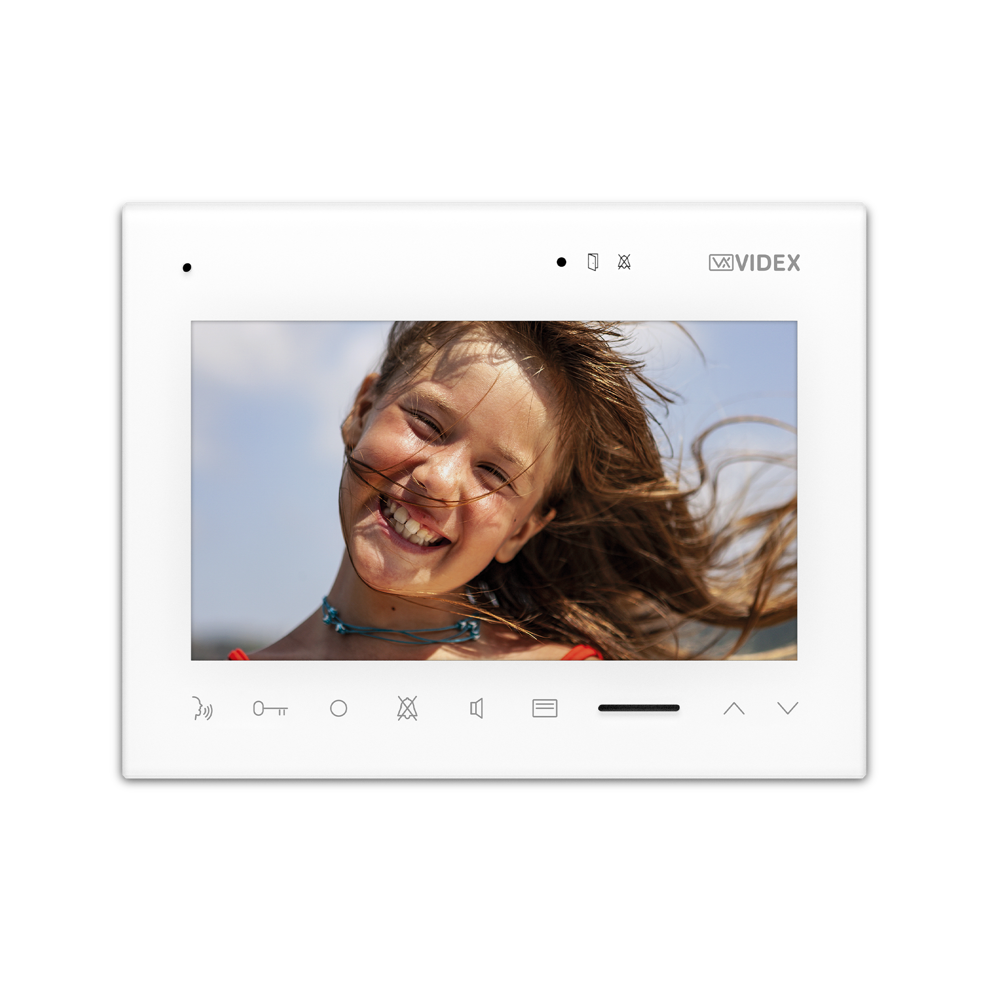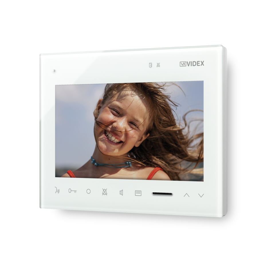 KRISTALLO series video intercom for VX2300 full-duplex speakerphone system, 7” LCD TFT monitor, 8 soft touch buttons for functions: conversation, call rejection, auto-power on, door opener, intercom call, video camera switching, privacy service, remote relay activation Cod. 2305. Local call input. Adjust contrast, brightness, call volume and privacy. Standard intercom function for up to 4 devices in the same column or junction box. Device configuration via dip-switch. Polished effect white polycarbonate material. Power supply from BUS or optional 12Vdc with Cod. 323/12. Surface mounting dimensions: 190x147x32mm. Wall installation through Cod. KRV7985/W, for table Cod. KRV7931, or flush through Cod. KRV7981 or KRV7983. Flush mounting dimensions: 190x147x9mm.