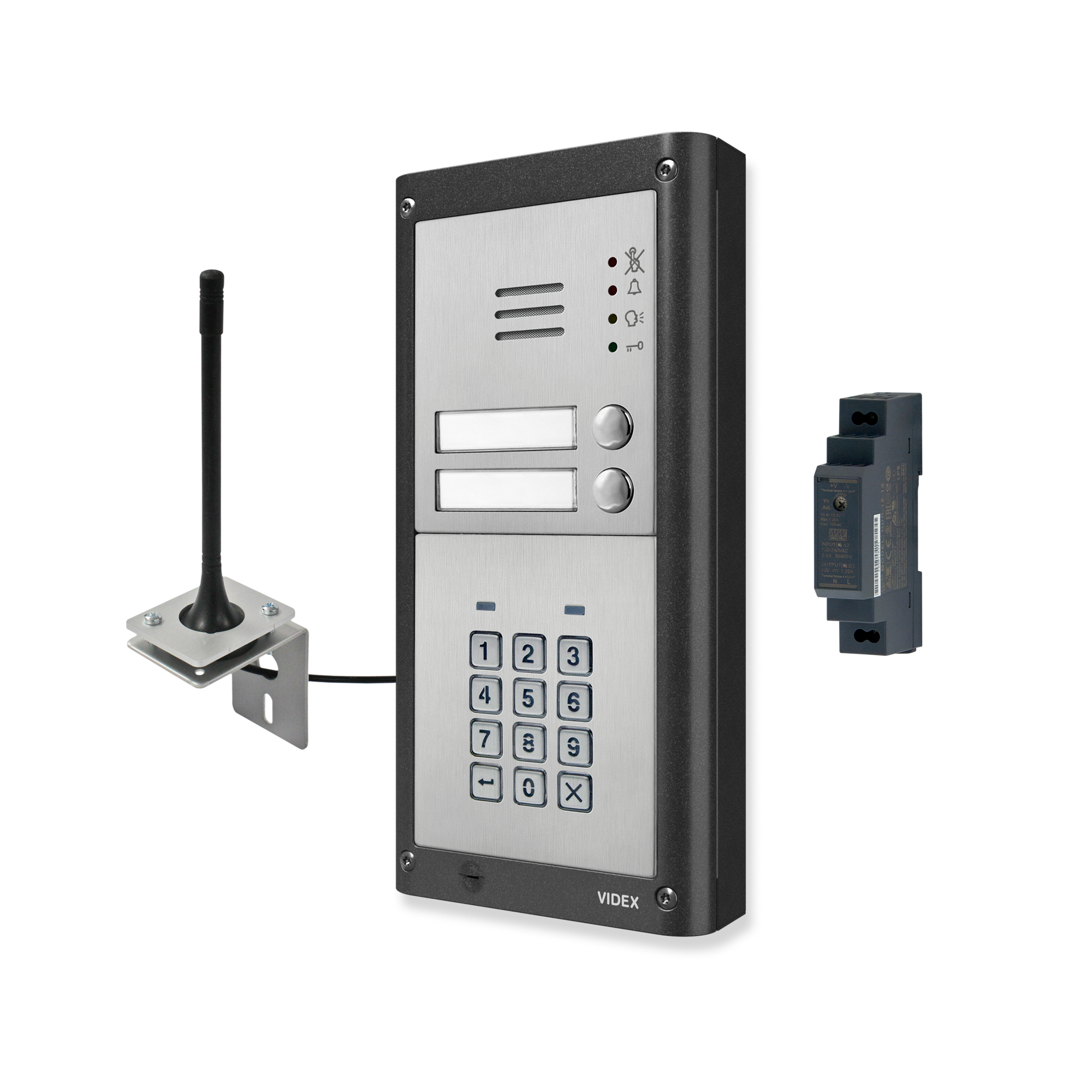 Surface twin-family wireless intercom kit with numeric keypad with numeric keypad, GSM system, expandable solution consisting of: 1 pc. 4810/4G-2/M, 1 pc. 4903/M, 1 pc. 4882, 1 pc. 434, 1 pc. HDR-15-12.