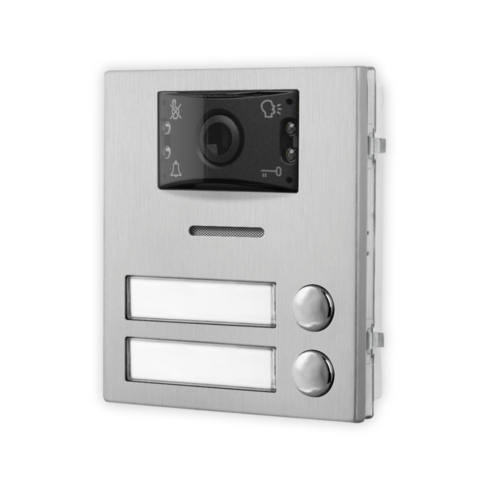 Modulo audio/video a 2 pulsanti serie 4000 per sistema VX2300, telecamera integrata CMOS da 1/4" a colori con sensibilità min 1 Lux e risoluzione da 976x582 (PAL), visione wide angle (V80°-170°H). 4 LED luce bianca per la visione notturna. Microfono ed altoparlante integrato 8Ω/2W e funzione audio full-duplex. Lettore di prossimità RFID integrato (125kHz EM4102) per l'utilizzo fino a 1.000 chiavi di cui fino a 60 programmabili direttamente dal modulo utilizzando la card master in dotazione. Interfaccia BUS-485. Connettore IDC per il collegamento tramite cavo flat (in dotazione) con altri moduli opzionali (massimo 8 moduli per un totale di 42 pulsanti). 4 LED di segnalazione visiva di stato impianto: occupato, chiamata in corso, inizio conversazione ed apertura porta. Segnalazioni acustiche per ipovedenti: inizio conversazione ed apertura porta. Tempo di apertura porta e conversazione configurabili. 1 relè di serie a contatti puliti C-NO-NC (max 24Vac/dc - 2A) con la possibilità di configurare la scarica capacitiva (max 12Vac/dc - 1A) per il pilotaggio diretto della serratura, un'uscita SSR (relè stato solido, max 60Vdc/40Vac - 0,1A) per l'attivazione del secondo cancello ed un ingresso per l'apertura porta diretta (PTE). Livelli del microfono e dell' altoparlante regolabili. Retroilluminazione del cartellino informativo con LED di colore blu. Microfono da alloggiare nel vano specifico dei telai porta moduli che consente una migliore resa fonica anche in ambienti rumorosi azzerando inoltre eventuali problemi di effetto larsen. Placca in acciaio inox satinato AISI 316 (marine grade) che conferisce durabilità in installazioni soggette ad agenti atmosferici e in prossimità di ambienti marini. Placca antivandalica IK07 e grado di protezione IP65. Temperatura di esercizio -20°/+60°C. Alimentazione da BUS. Configurazione semplificata del dispositivo attraverso dip-switch oppure kit di programmazione cod. 2209. Dimensioni 103x120x43mm. Ingombro 1 modulo.