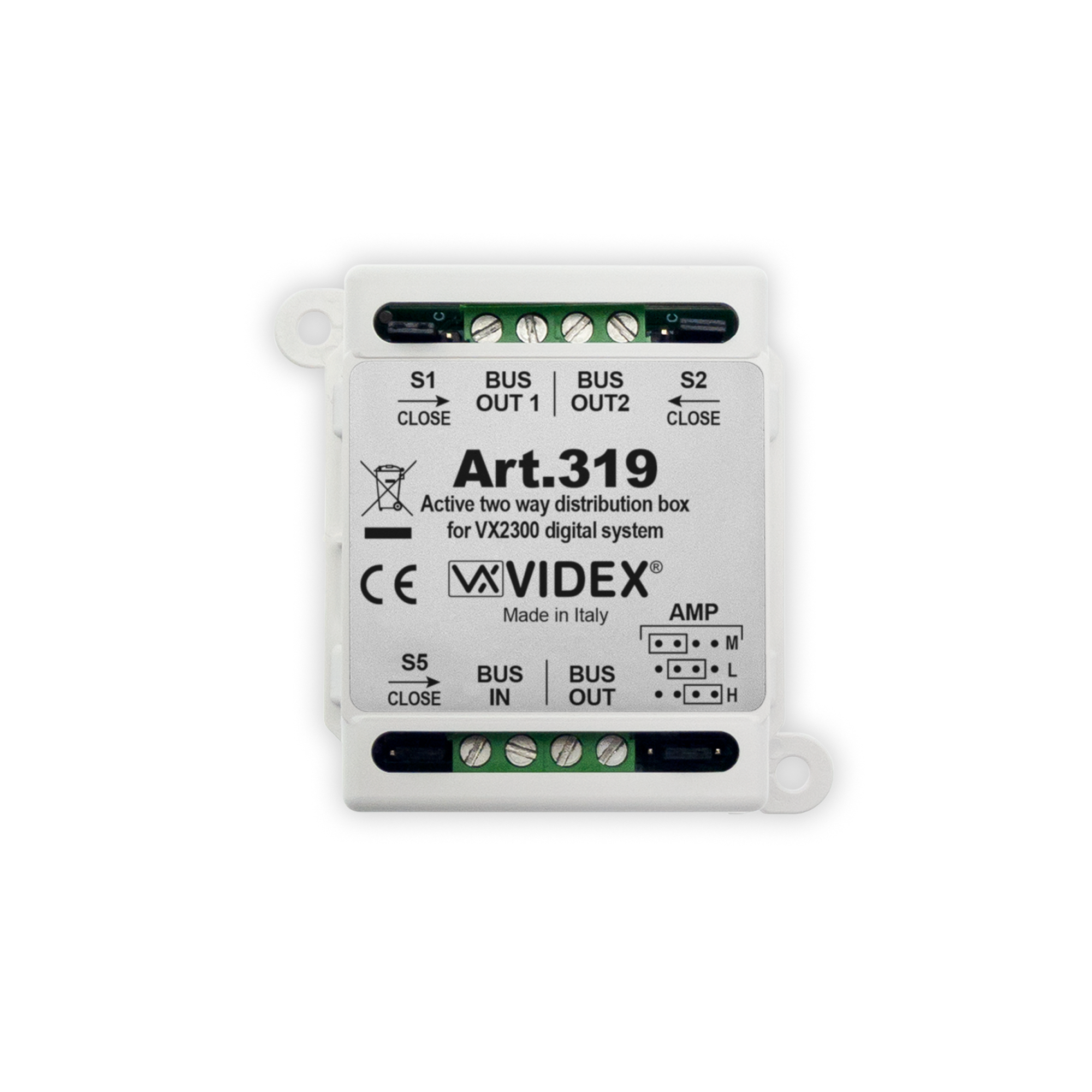 | Funzione | L’unità distribuisce il segnale BUS su 2 uscite ciascuna da collegare ad un citofono o videocitofono. Il jumper AMP permette di regolare l’amplificazione: per facilitare la regolazione sono contrassegnate le posizioni corrispondenti ad un livello di amplificazione medio (M), basso (L) e alto (H). L’amplificazione non interviene sull’uscita passante BUS OUT. L’Art. 319 ha anche la funzione di isolare le uscite dalla linea principale in caso di corto circuito su una di esse: questo evita che l’intero sistema venga compromesso in caso di corto circuito all’interno di uno degli appartamenti. |