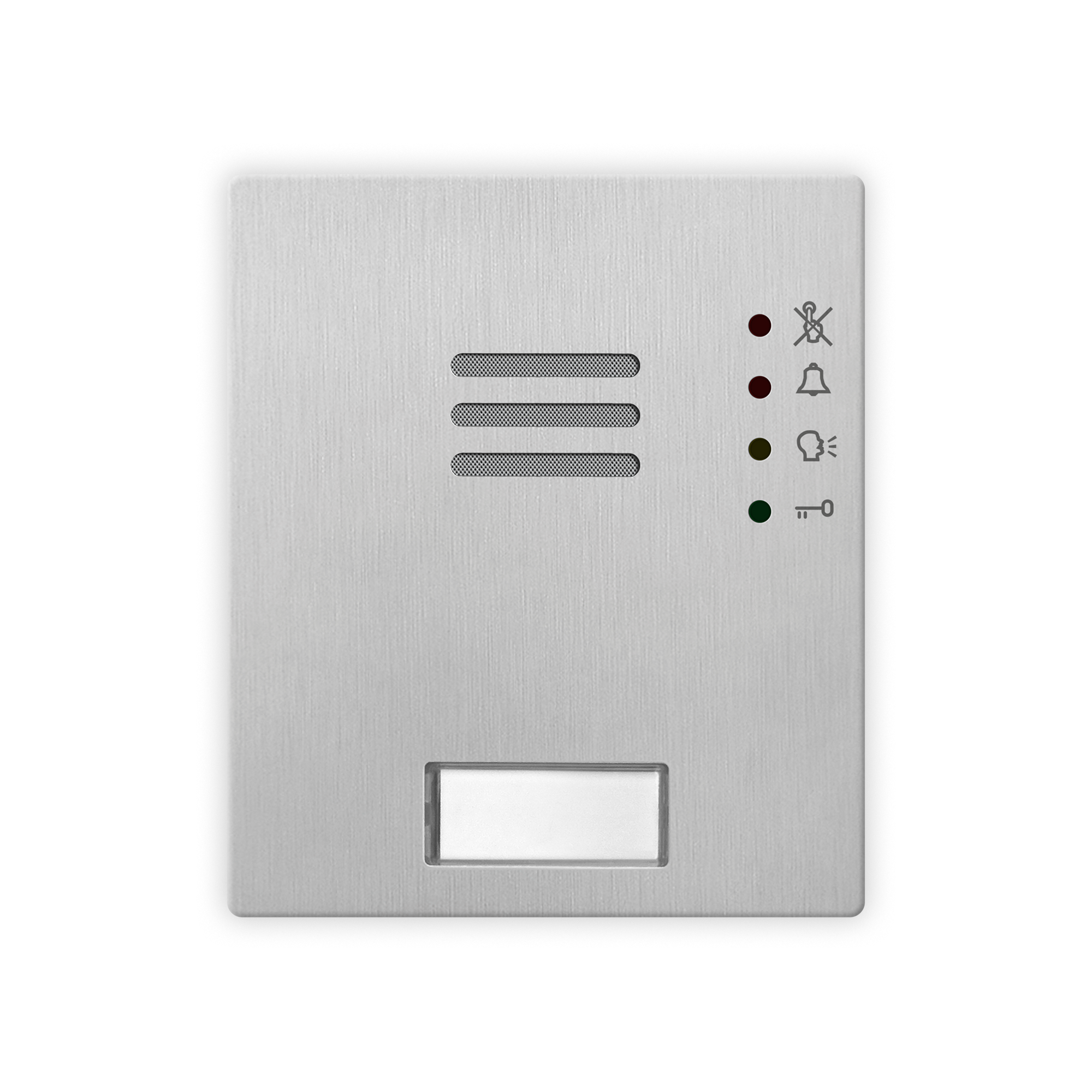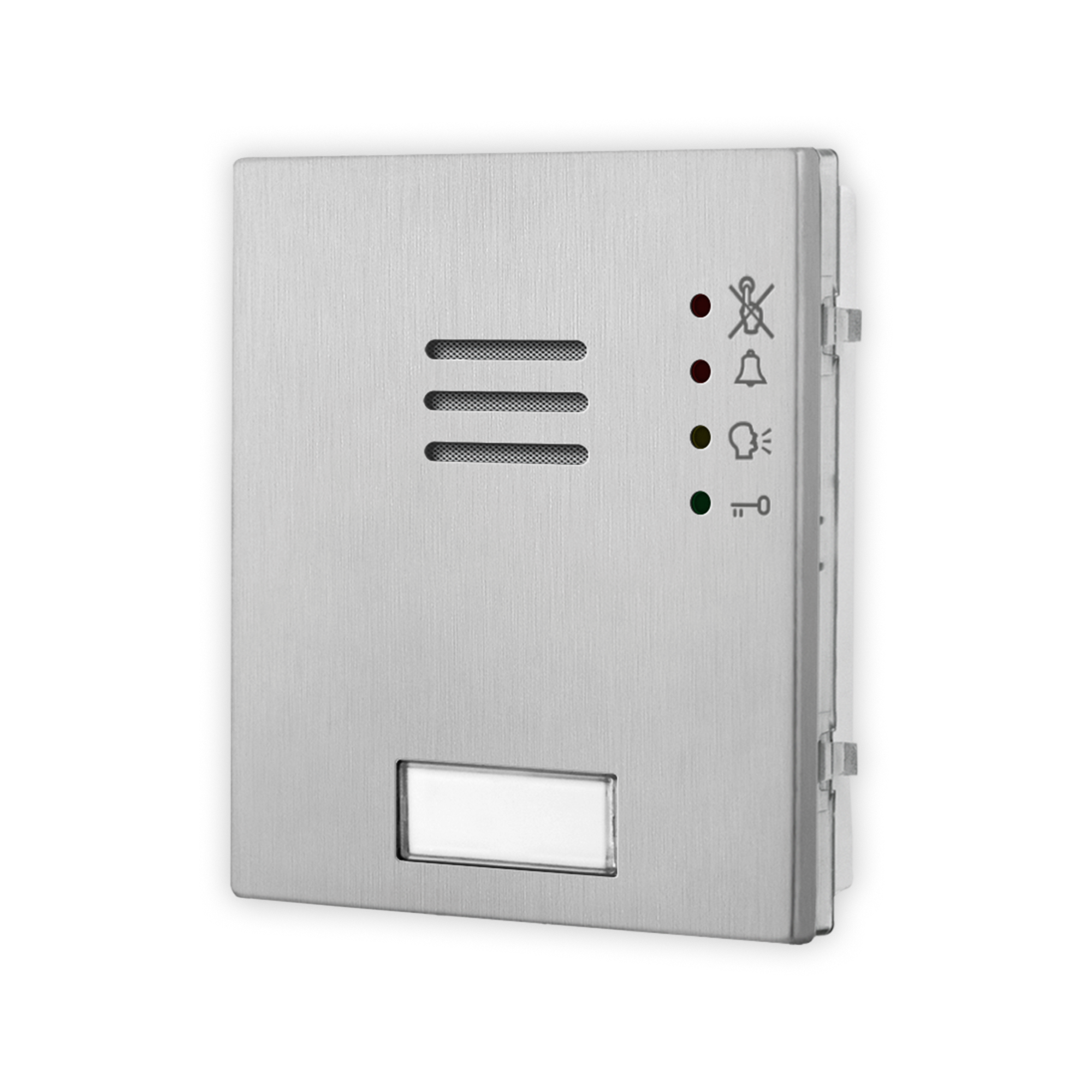 Modulo audio a 0 pulsanti serie 4000 per sistema VX2300 con microfono ed altoparlante integrato 8Ω/2W e funzione audio full-duplex. Lettore di prossimità RFID integrato (125kHz EM4102) per l'utilizzo fino a 1.000 chiavi di cui fino a 60 programmabili direttamente dal modulo utilizzando la card master in dotazione. Interfaccia BUS-485. Connettore IDC per il collegamento tramite cavo flat (in dotazione) con altri moduli opzionali (massimo 8 moduli per un totale di 42 pulsanti). 4 LED di segnalazione visiva di stato impianto: occupato, chiamata in corso, inizio conversazione ed apertura porta. Segnalazioni acustiche per ipovedenti: inizio conversazione ed apertura porta. Tempo di apertura porta e conversazione configurabili. 1 relè di serie a contatti puliti C-NO-NC (max 24Vac/dc - 2A) con la possibilità di configurare la scarica capacitiva (max 12Vac/dc - 1A) per il pilotaggio diretto della serratura, un'uscita SSR (relè stato solido, max 60Vdc/40Vac - 0,1A) per l'attivazione del secondo cancello ed un ingresso per l'apertura porta diretta (PTE). Livelli del microfono e dell' altoparlante regolabili. Retroilluminazione del cartellino informativo con LED di colore blu. Microfono da alloggiare nel vano specifico dei telai porta moduli che consente una migliore resa fonica anche in ambienti rumorosi azzerando inoltre eventuali problemi di effetto larsen. Placca in acciaio inox satinato AISI 316 (marine grade) che conferisce durabilità in installazioni soggette ad agenti atmosferici e in prossimità di ambienti marini. Placca antivandalica IK09 e grado di protezione IP65. Temperatura di esercizio -20°/+60°C. Alimentazione da BUS. Configurazione semplificata del dispositivo attraverso dip-switch oppure kit di programmazione cod. 2209. Dimensioni 103x120x43mm. Ingombro 1 modulo.