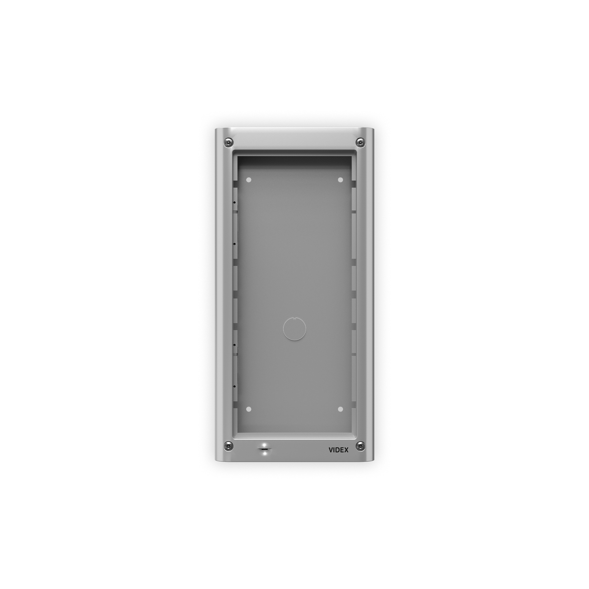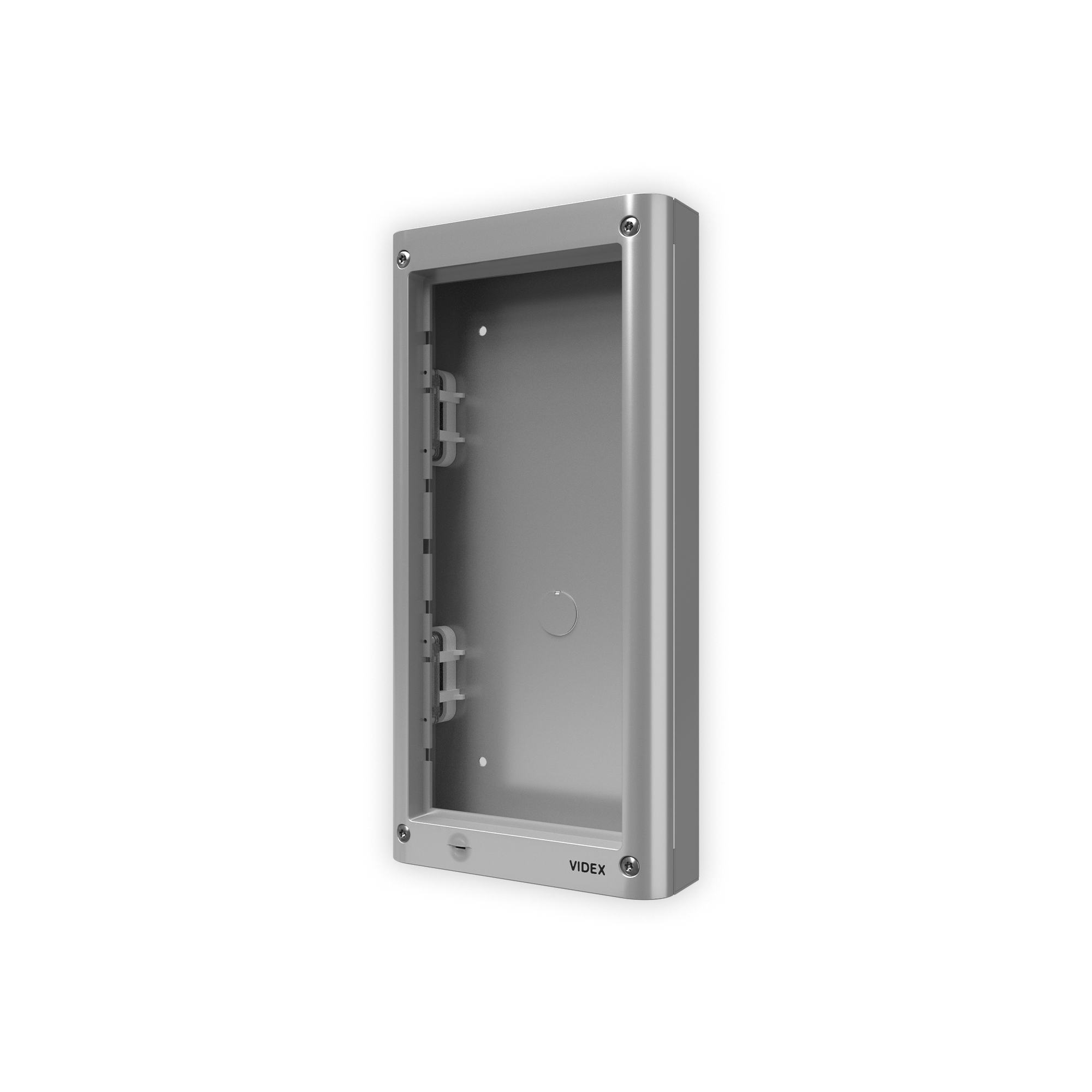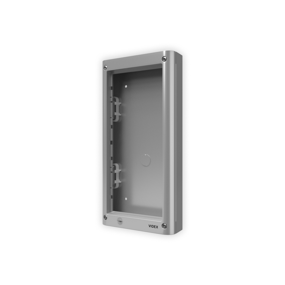 Composto da: scatola da superficie e telaio portamoduli. Il telaio comprende 4 viti di sicurezza tipo Torx, una guarnizione anti-infiltrazioni e cerniere laterali per consentire l’apertura del telaio per l’installazione o ispezione. Dimensioni 135x280x44mm, colore grigio alluminio.