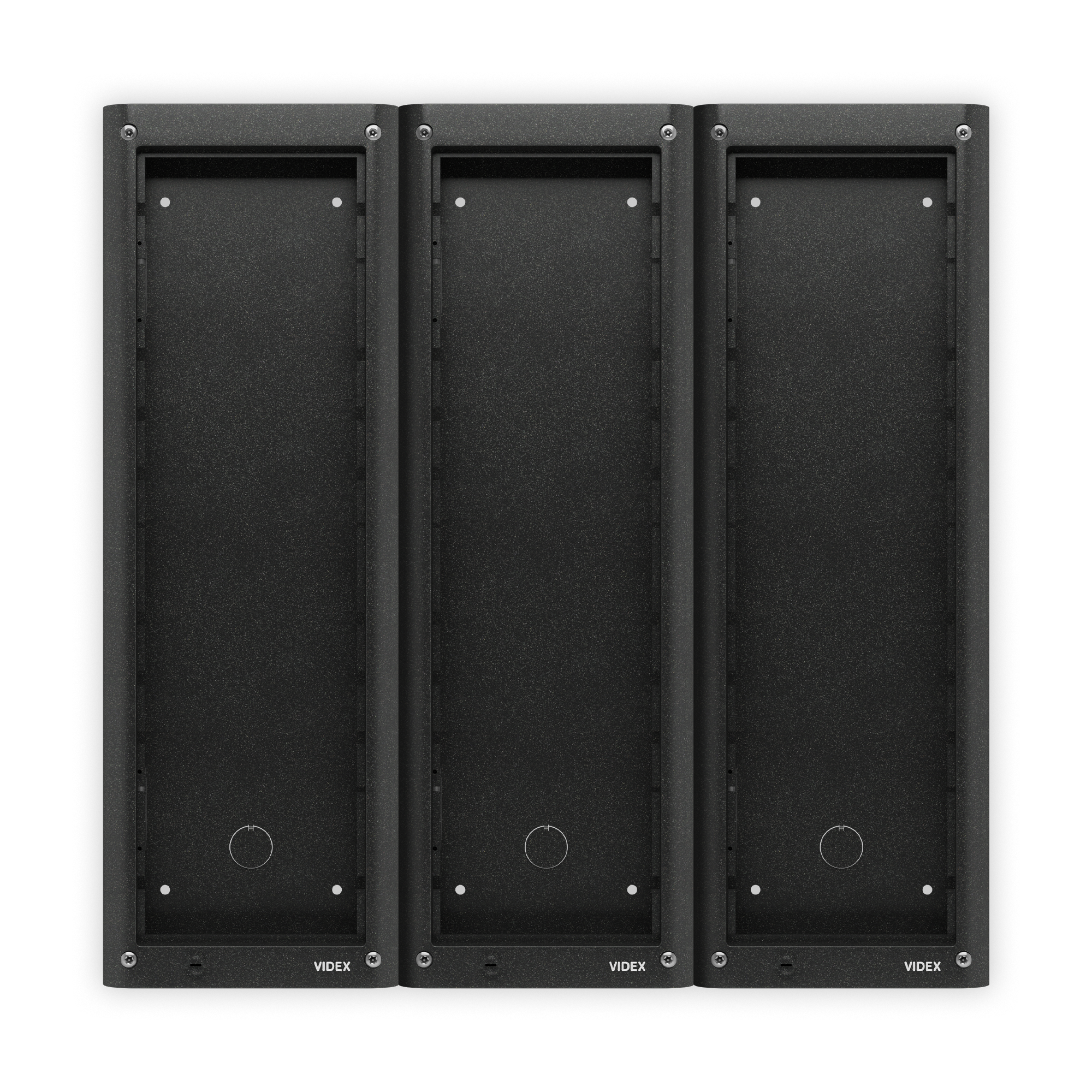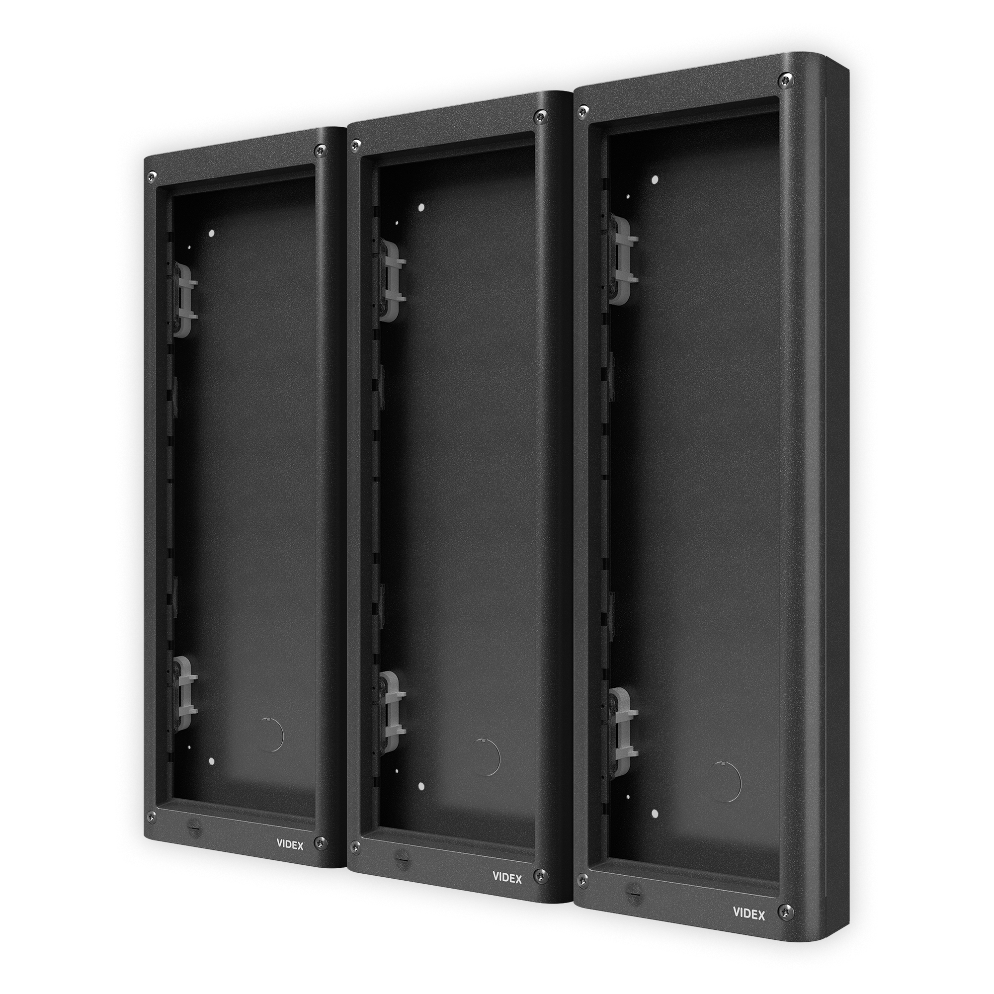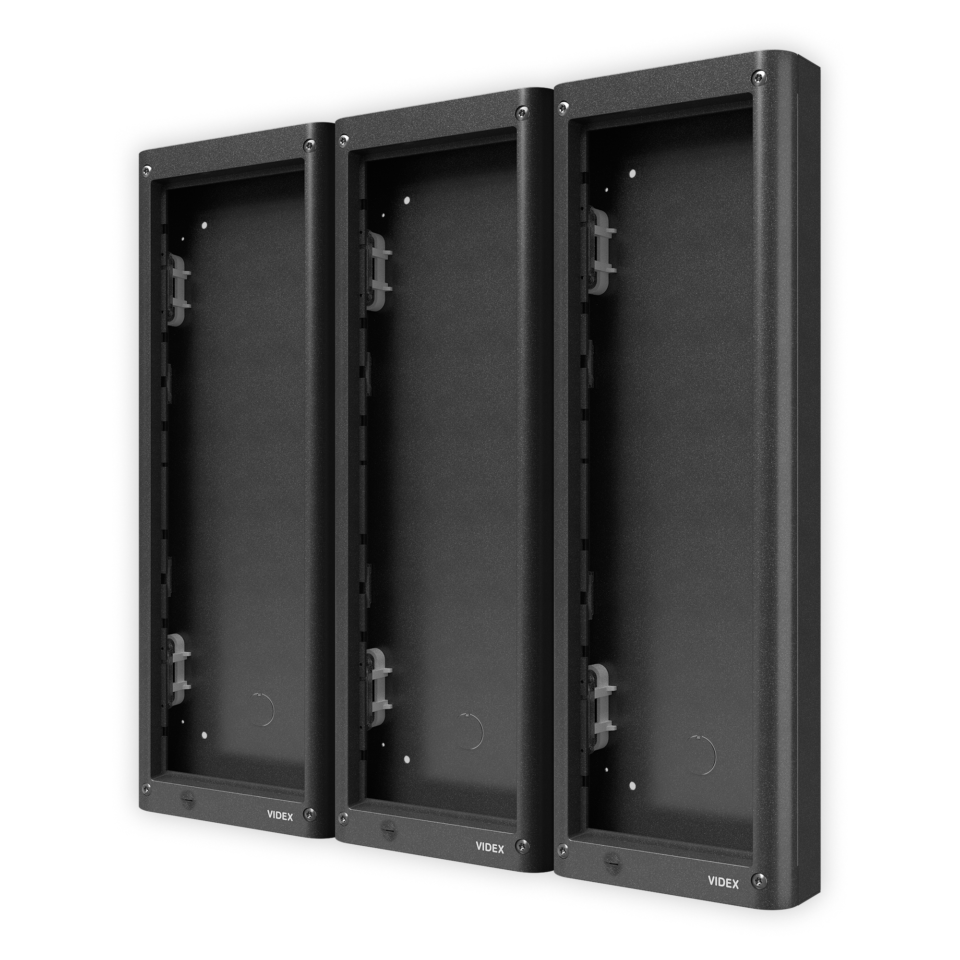 Composto da: scatola da superficie e telaio portamoduli. Il telaio comprende 12 viti di sicurezza tipo Torx, una guarnizione anti-infiltrazioni e cerniere laterali per consentire l’apertura del telaio per l’installazione o ispezione. Dimensioni 405x400x44mm, colore grigio canna di fucile.