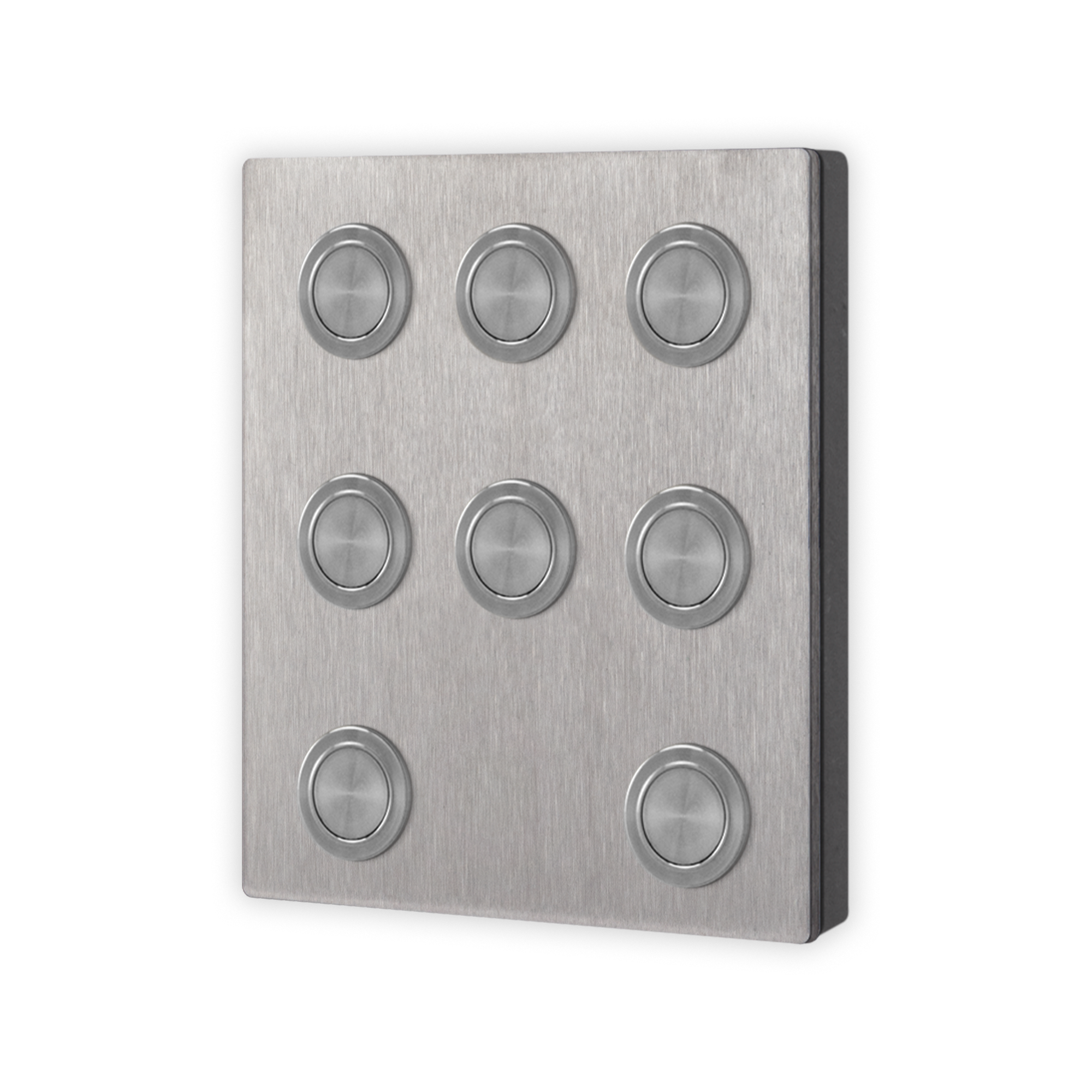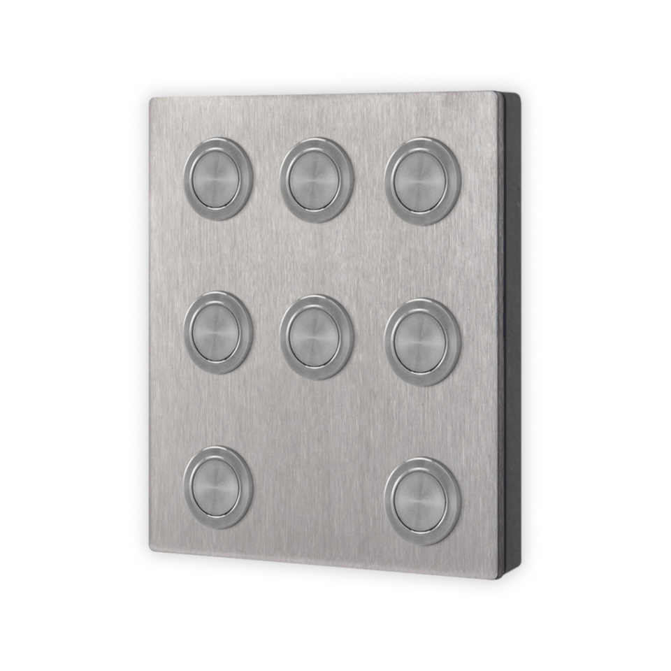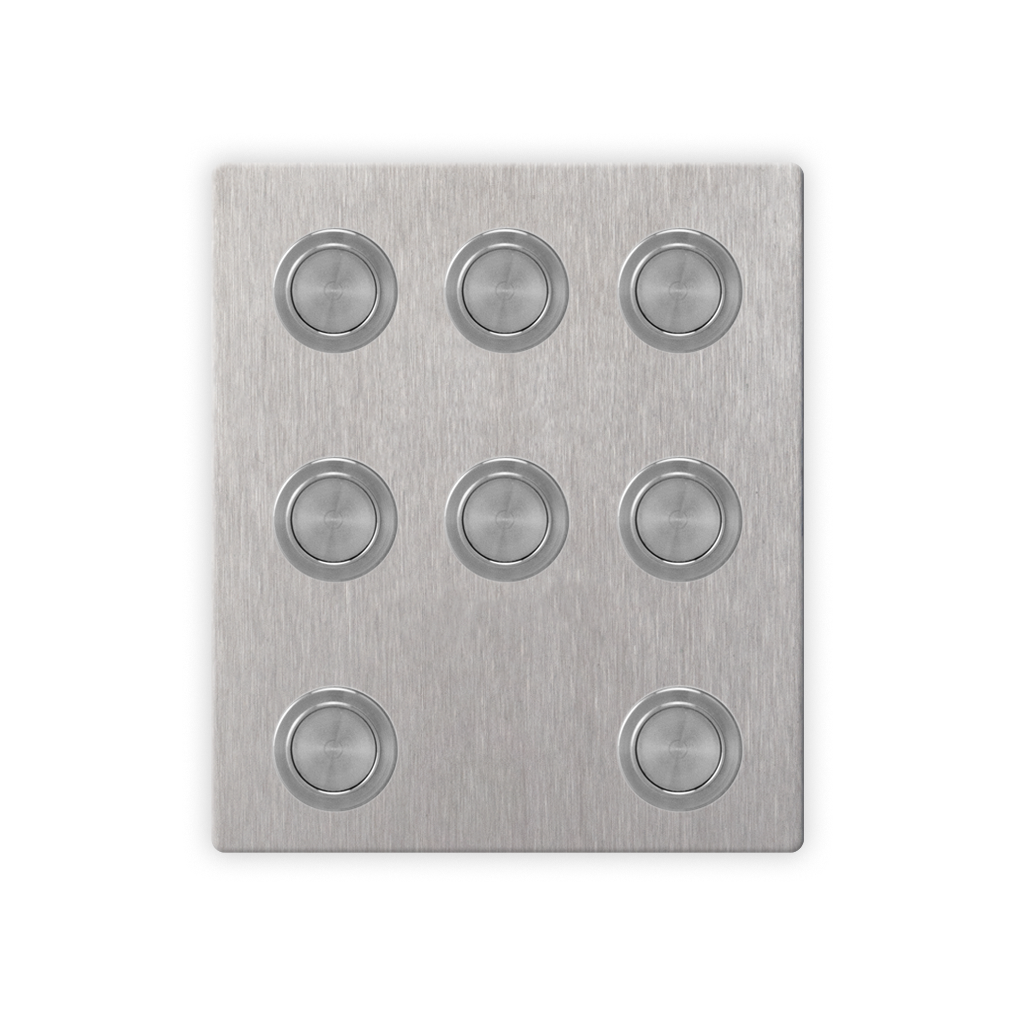 Modulo pulsanti di chiamata a 8 pulsanti serie 4000 IK09 per sistema GSM. Connessione tramite morsettiera di moduli pulsanti opzionali per un totale di 24 pulsanti. Placca in acciaio inox spazzolato AISI 316 (marine grade) che conferisce durabilità in installazioni soggette ad agenti atmosferici e in prossimità di ambienti marini. Placca antivandalica IK09 e grado di protezione IP65. Temperatura di esercizio -20°/+60°C. Dimensioni 103x120x43mm. Ingombro 1 modulo.