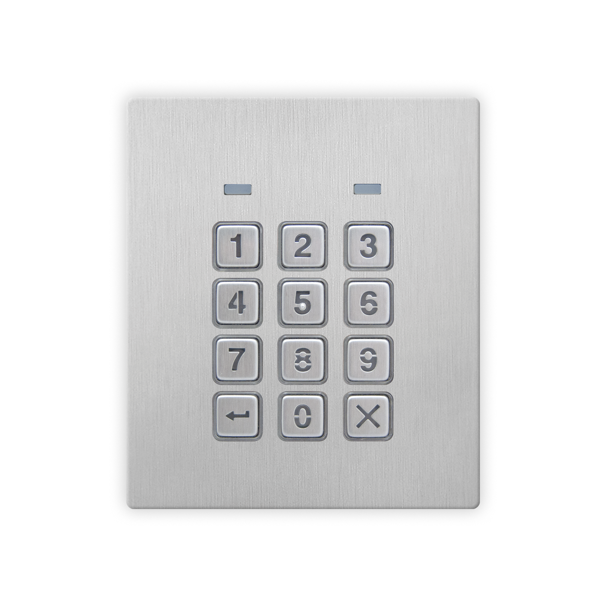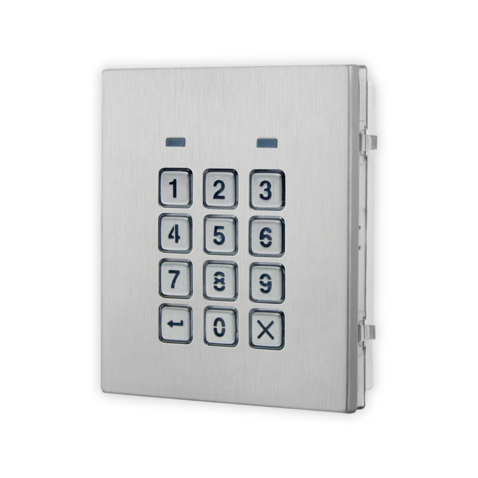 Módulo de controlo de acessos autónomo e centralizável para sistemas IPure, VX2300 e GSM. Retroiluminação dos 12 botões com LED azul, 2 LED para sinalizações de estado/funcionamento. 2 relés com contatos secos C, NC, NO (24Vca/cc - 2A) programável para a ativação temporária (01 ... 255 segundos) ou para o funcionamento em comutação. Configuração de 1.000 códigos a 8 algarismos combináveis a cada relé. 2 entradas PTE (ativo/baixo) para comandar diretamente os relés 1 e 2. Sinalização acústica e visual durante o funcionamento. Duas modalidades operativas: modalidade autónoma e distribuída através de RS-485 com centrais cód. 1050 ou 1052. Placa à prova de vandalismo IK07 e grau de proteção IP65. Temperatura de trabalho -20°/+60 °C. Alimentação 12/24Vca/cc. Programação do PC. Dimensões 103x120x43 mm. Dimensão externa 1 módulo.